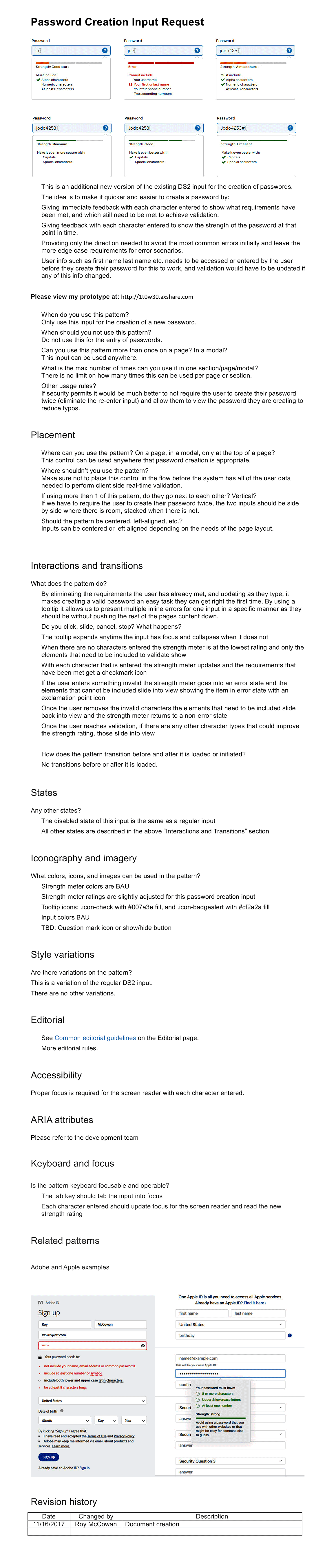 Deliverables: Mocks, prototype, and new pattern proposal My biggest challenge: To propose a design solution that would accomplish the goal without breaking too far out of the existing design patterns.How I resolved it: I took existing patterns and explored using them in a new way. In this case it was presenting both requirements and errors inside the existing tooltip as you need them, in an immediate feedback way. I collaborated with other designers on the design patterns team until we had a good first draft. Then took the idea through the new design pattern request process by submitting the request form. The new control was approved to be built and added to the library at the end of 2017. |